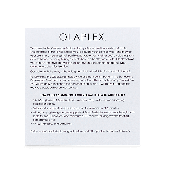 The original, patented bond building chemistry for dramatically repairing and restoring the hair fibre from within. Strengthen hair and boost its elasticity with the revolutionary OLAPLEX Professional Salon Kit.