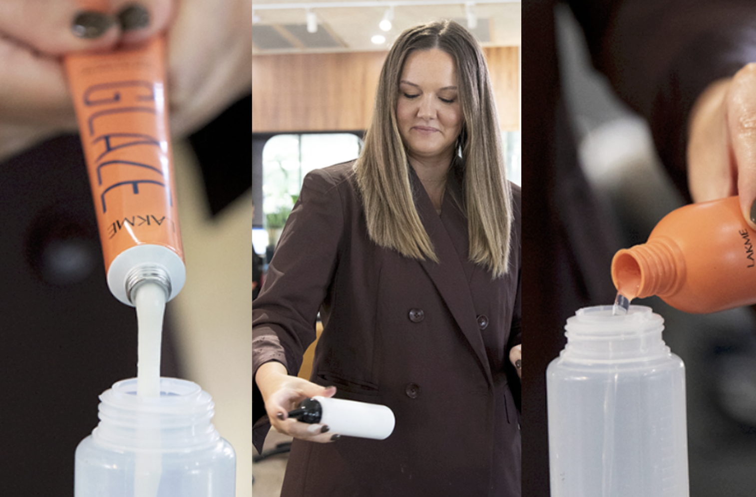 imagesrj6q.png Image: Chantelle Cowcher, Owner of Telleish Hair Studio, Lakme Brand Ambassador using Lakmes newest colour range - Glaze, mixed with a liquid developer to create a customised demi-permanent toner for her client.